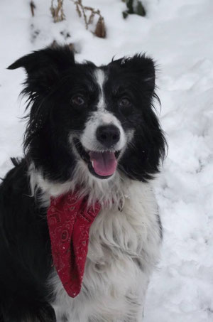 Elle était très joueuse, sautait très haut pour attraper les balles qu’on lui jetait, elle est restée très joueuse avec les autres chiens et avec nous jusqu’au bout, elle a bien grandi. Elle nous a accompagné dans tous les moments importants de vie, le lendemain de notre mariage, elle avait 1 an, était pleine de confettis, elle partageait nos soirées entre amis, où elle soupirait parfois fortement car on veillait et qu’on discutait , ça l’empêchait de dormir sereinement, ça nous faisait rire ; lors de la naissance de Sarah, notre premier enfant , elle s’est demandée ce qui se passait, elle n’était plus la seule, mais elle a été adorable, gentille, affectueuse… et quand nous avons remis ça pour le 2ème, elle était blasée ! Au début, je me rappelle aussi que dès qu’elle entendait un jouet qui couinait elle pleurait aussi, comme si c’était l’écho d’un petit chiot, son instinct maternel surement, et pourtant elle n’a jamais eu de bébés… et quand elle prenait des peluches, elle les attrapait avec une telle délicatesse, sans jamais les mordre…